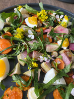 Lay out radishes, carrots, sorrel, and broccoli flowers on a plate. Drizzle the dressing generously over the vegetables. Cut the egg into small pieces and lay out on the plate. Add cilantro, a pinch of salt, and desired amount of pepper. Enjoy!